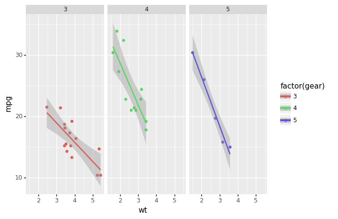 (ggplot(mtcars, aes('wt', 'mpg', color='factor(gear)'))