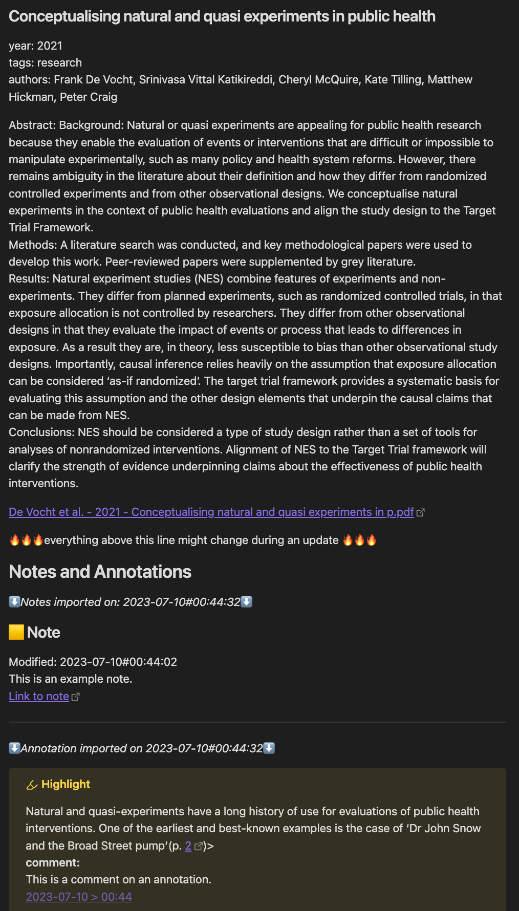 Later on, if you need to link to the Obsidian note on this then just use the double-bracket format. This paper has citekey devocht_conceptualising_2021 so we would use [[devocht_conceptualising_2021]] to link to it.