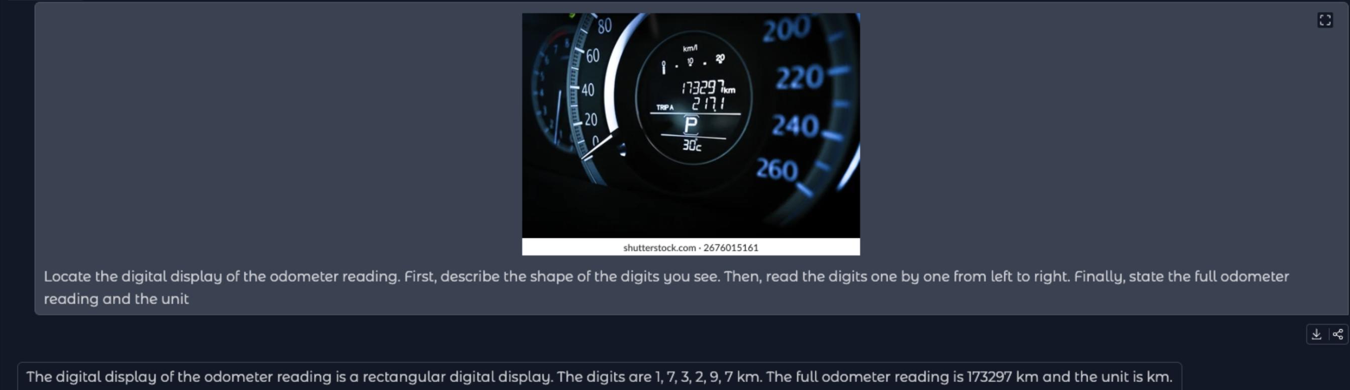 The 8 is misread as a 6 despite careful, and optimised, prompting, e.g. Locate the digital display of the odometer reading. First, describe the shape of the digits you see. Then, read the digits one by one from left to right. Finally, state the full odometer reading and the units.