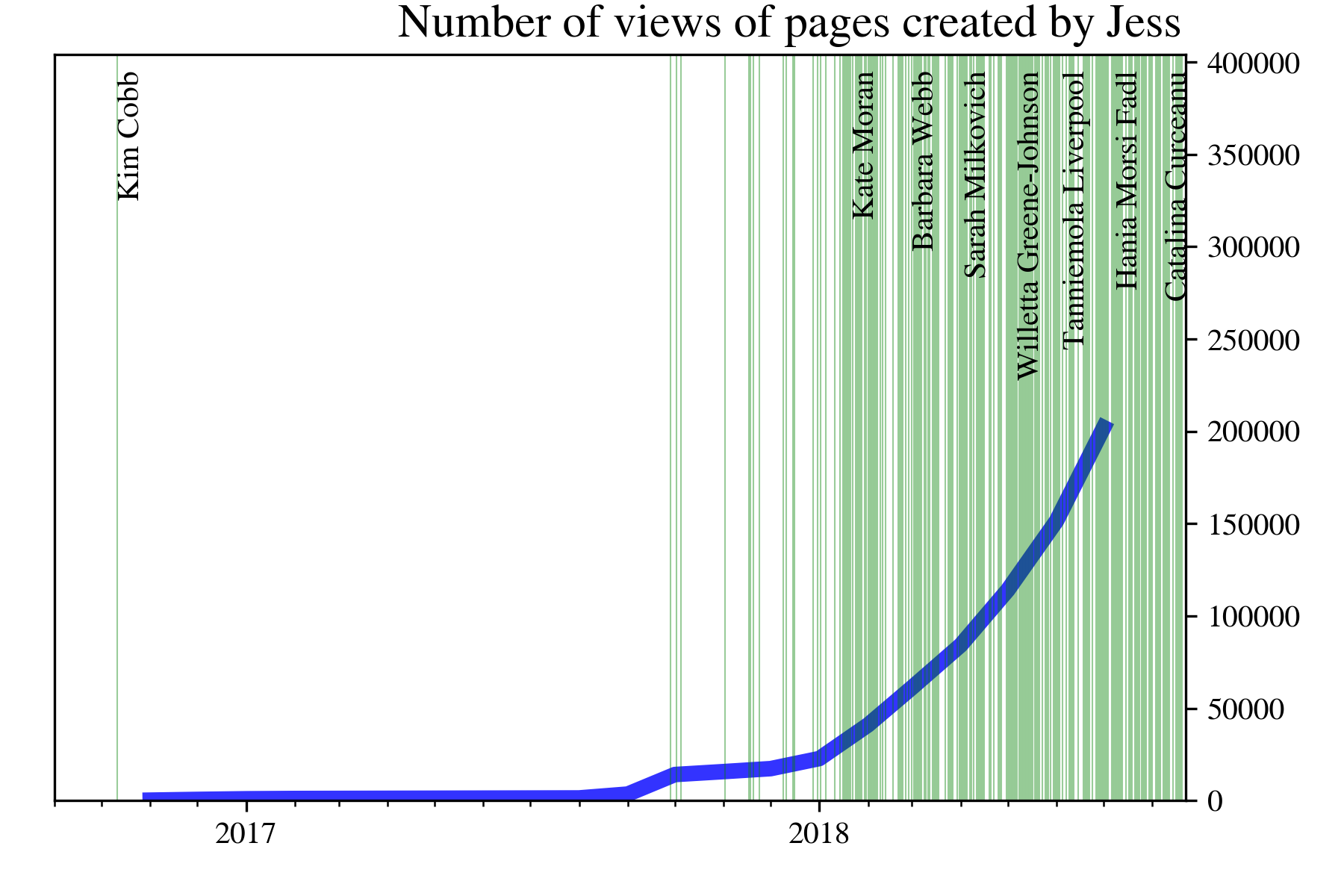 The blue line shows the cumulative total number of page views of all pages. The green lines show just how much hard work this has been - there is one for every individual page created. I’ve put in a few of the scientists’ names. Note that the page views data lag a bit behind the page creations.